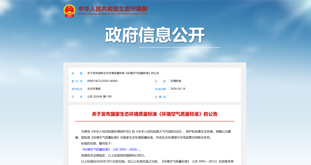 2026年3月1日起,一项关乎每个人呼吸健康的重要新政正式落地。生态环境部与国家市场监管总局联合发布的新版《环境空气质量标准》(GB 3095—2026) 开始实施,这是时隔14年后,我国对环境空气质量提出的更严格要求。